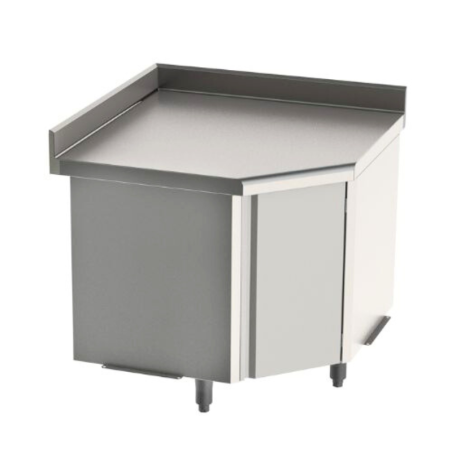 - Ce meuble bas d’angle (pour meubles de largeur 700) en inox est équipé d’une porte battante doublée sans serrure, avec charnière réversible, une étagère basse intérieure et des pieds réglables.