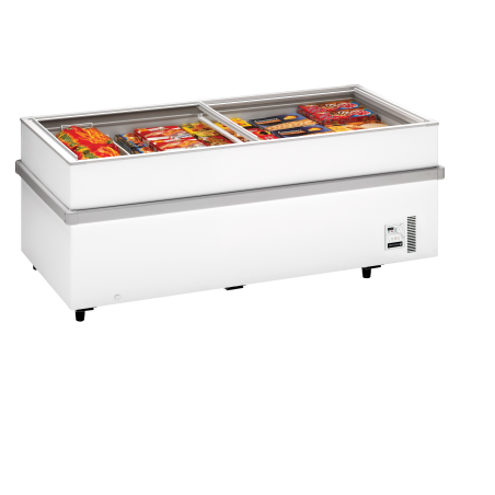 - Il possède une capacité de 838 litres et permet une excellente mise en valeur des produits grâce à ses grands couvercles vitrés.