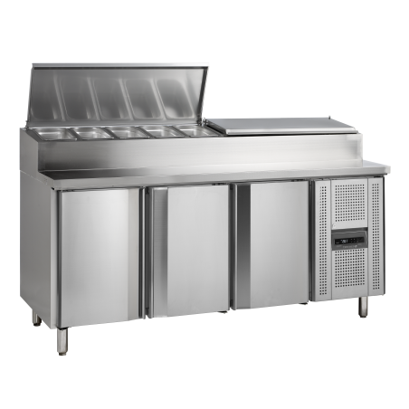 - La cuve de refroidissement est surélevée pour pouvoir accueillir des bacs GN1/3 sans réduire la capacité de stockage des placards, tout en offrant un plan de travail digne de ce nom.