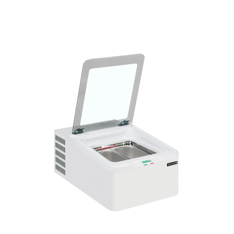 Modèle sur comptoir|Présentoir incliné pour une meilleure présentation|Convient aux bacs Napoli (non fournis)|Idéal pour les buffets|Accès facile aux produits|Couvercle vitré plat à charnières|Refroidissement statique|Pieds ajustables|Bac pour sucettes glacées en option