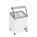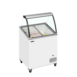 Pare-haleine en verre incurvé|Couvercles d'angle coulissants avec verrou|Rangement sous les paniers|Roulettes avec freins|Classe climatique 5 pour d’excellentes performances dans les environnements chauds|En option - paniers à crème glacée pour bas plastiques|Ce modèle peut contenir 4 bacs en plastique de 5 l