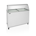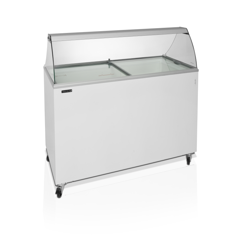 Pare-haleine en verre incurvé|Couvercles vitrés plats coulissants avec verrou|Rangement sous les paniers|Roulettes avec freins|Revêtement laqué blanc|En option - paniers à crème glacée pour bas plastiques|Ce modèle peut contenir 10 bacs en plastique de 5 l